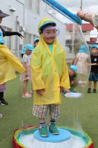 屋根より高く、遠くまで飛ぶシャボン玉に、みんなから歓声が上がりました。