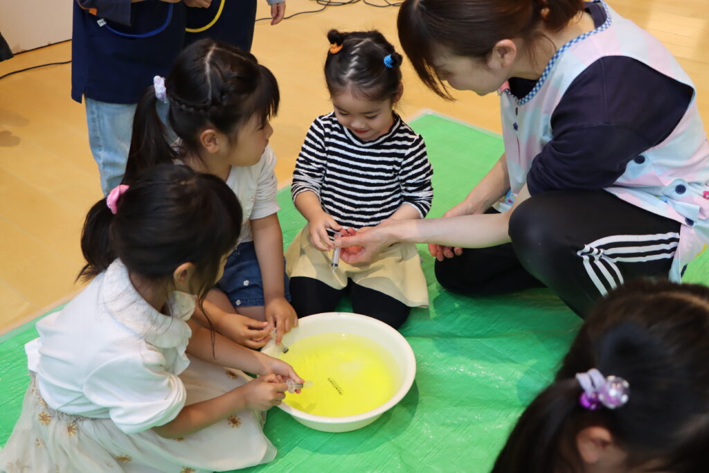 注射器体験では、洗面器に張った色水を注射器で吸い取りました。
