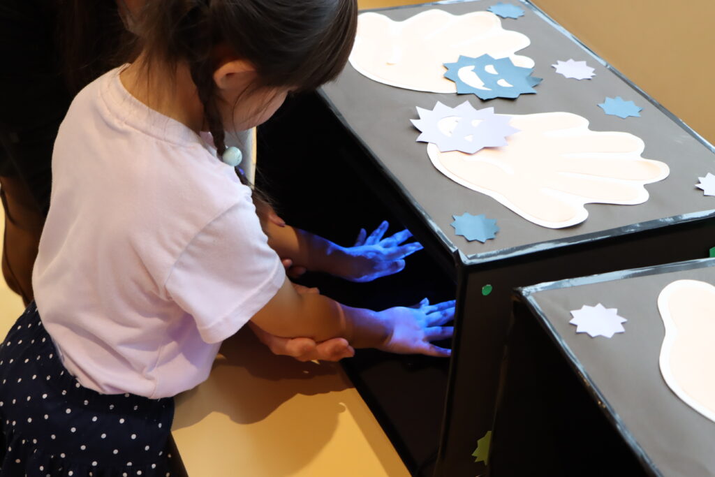手洗いチェックは、上手に手洗いが出来たかを、特殊なライトに手をかざして調べました。