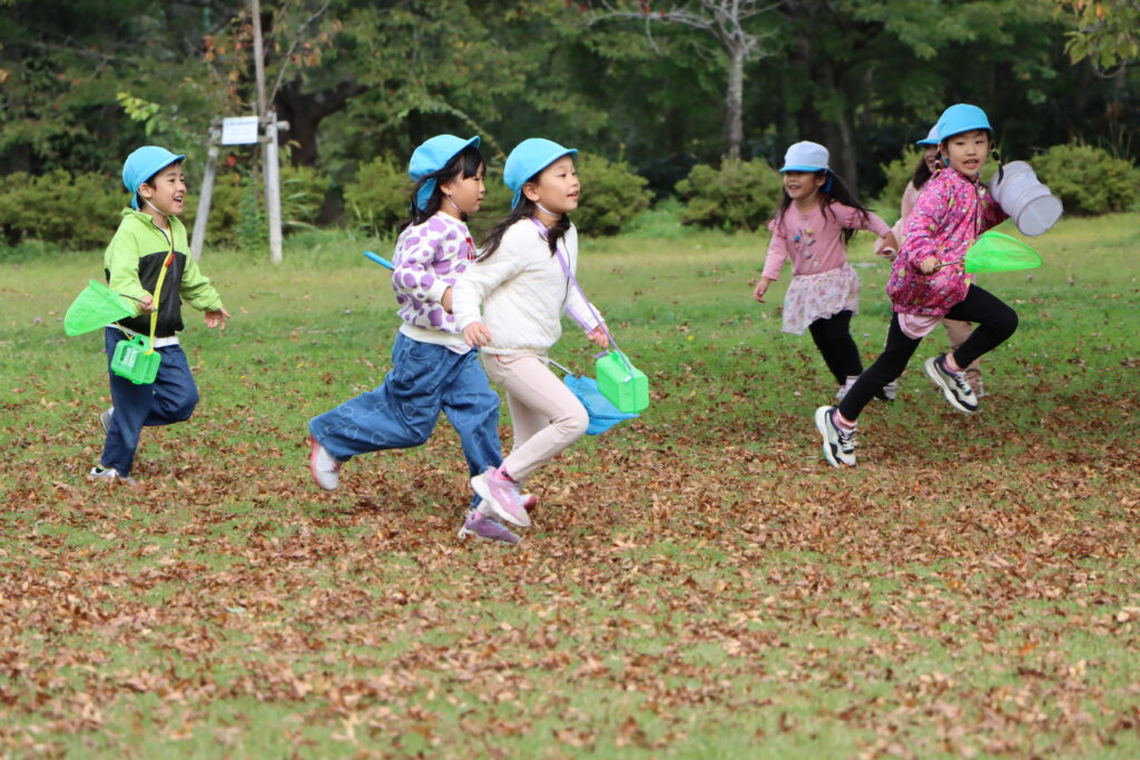 広場では、虫捕り網を持って、生き物を探し回りました。
